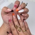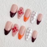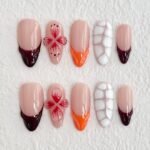 This design blends deep red and orange hues that evoke the rich colors of autumn leaves, coupled with intricate floral details. The bold contrast between the soft pink base and the vibrant tips represents a powerful transformation, much like the changing seasons. The addition of geometric patterns and natural textures reflects the harmony between nature’s cycles and the beauty of embracing change. Ideal for those who embrace growth, transformation, and the beauty in life’s transitions.