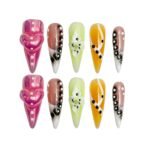 Candy Bloom is a delightful press-on nail set bursting with character. Featuring a vibrant mix of glossy pinks, citrus orange, lime green, and soft mocha tones, this set is a feast for the eyes. 3D florals, swirling ribbons, and polka dot accents bring a touch of whimsy and joy, while the bold sculpted hearts add an irresistibly sweet, youthful flair. Perfect for spring picnics, playful weekends, or whenever your mood calls for something fun, fruity, and fresh.
