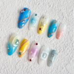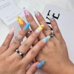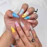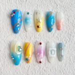 This design incorporates a blend of dreamy colors—blues, yellows, and soft whites—reminiscent of the vast sky and celestial bodies. The intricate lines and metallic accents evoke the connection between the stars and the earth. The addition of colorful gems and the delicate touch of gradient hues creates a sense of depth and ethereal beauty. “Celestial Lines” is perfect for someone who enjoys blending boldness with elegance, drawing inspiration from the wonder and mystery of the universe.