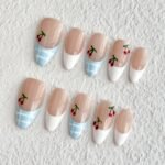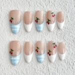 Capture the playful sweetness of summer with “Cherry Picnic,” a press-on nail set that brings fresh, sun-kissed charm to your fingertips. Featuring a natural nude base, each nail is accented with hand-painted red cherry motifs, cheerful blue gingham patterns, and crisp white French tips. The design evokes the carefree joy of outdoor picnics, warm breezes, and laughter under clear skies. Perfect for weekend outings, vacations, or anytime you want to add a dash of nostalgic fun to your look. Lightweight, easy to apply, and endlessly adorable — made for those who savor the simple joys of life.
