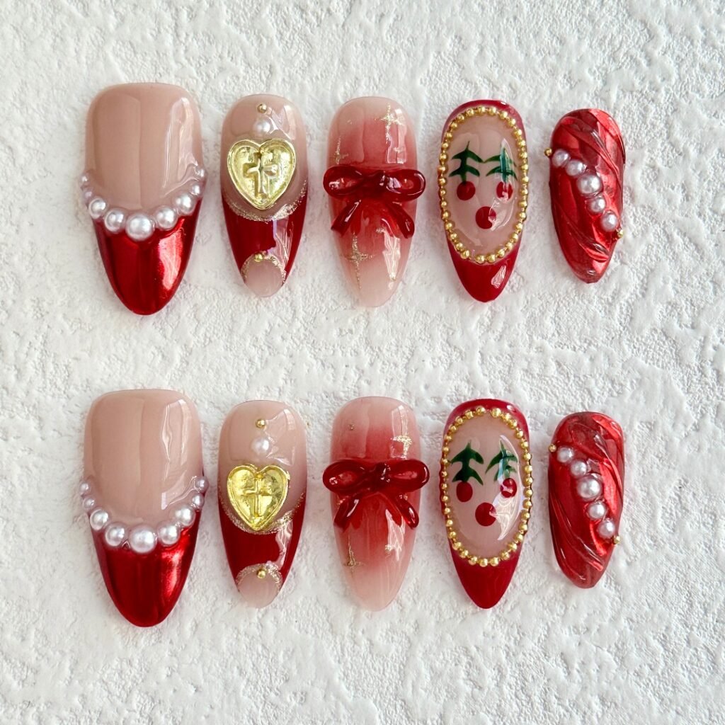 Cozy Reindeer Cottage is a charming holiday-inspired press-on nail set that blends rustic elegance with playful nostalgia. Soft oatmeal beige meets deep mulled wine and night-sky black, creating a snowy cabin vibe. 3D reindeer, festive wreaths, shimmering stars, and gem-studded trees turn each nail into a cozy Christmas tale. It’s the perfect set for fireplace nights, gift wrapping sessions, or sipping cocoa under fairy lights.