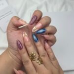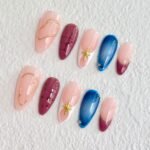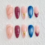 Galactic Bloom features a stunning gradient of rich pinks and deep blues, resembling the breathtaking hues of a nebula, complemented by delicate star-like embellishments. The textured burgundy nails add depth, while the soft pink tones represent the delicate beauty of a flower in full bloom. The gold accents and small stars are symbolic of the celestial wonders that guide growth and transformation. This design is perfect for someone who embraces change and seeks a balance between earth and the infinite universe.