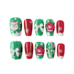Step into a festive dream with Jolly Wonderland, a playful press-on nail set that captures the magic of Christmas. From Santa’s rosy-cheeked smile to cozy mittens, candy canes, snowflakes, and ribboned bows — every detail bursts with holiday cheer. Vivid red and evergreen green contrast with snow-white accents, while charming 3D elements bring the season to life at your fingertips.