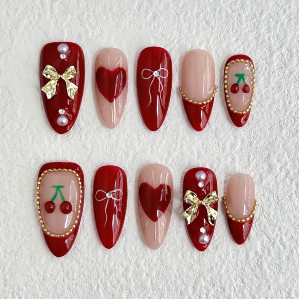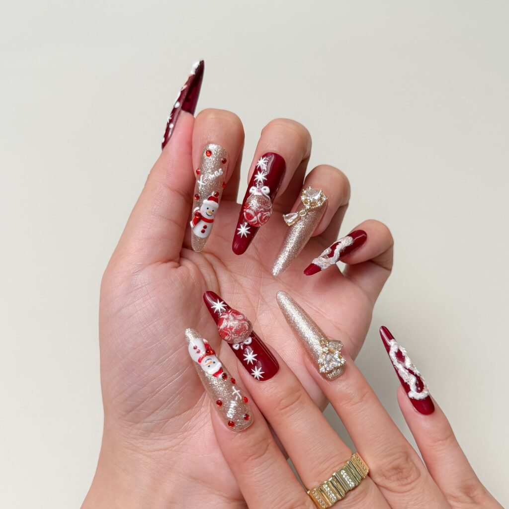 Step into a festive dream with Jolly Wonderland, a playful press-on nail set that captures the magic of Christmas. From Santa’s rosy-cheeked smile to cozy mittens, candy canes, snowflakes, and ribboned bows — every detail bursts with holiday cheer. Vivid red and evergreen green contrast with snow-white accents, while charming 3D elements bring the season to life at your fingertips.