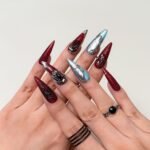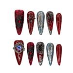 This bold press-on nail set features deep, blood-red hues that glisten with subtle sparkles, evoking the intensity of the night sky. The nails are adorned with intricate silver webbing and eerie metallic swirls, which suggest both fragility and strength. A unique, striking eye design rests on one nail, adding an element of surreal intrigue. Each nail carries its own twisted beauty, from the unsettling, yet captivating, spider webs to the darker metallic touches that catch the light.