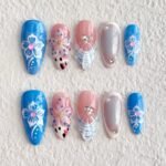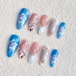 Capture the easy charm of sun-drenched days with “Summer Breeze,” a press-on nail set that radiates the joyful spirit of a seaside summer. Featuring a fresh palette of ocean blues and soft nudes, this playful design combines hand-painted florals, airy plaid accents, and whimsical 3D blooms kissed with dots of color and shimmer. Light, carefree, and full of wonder, it’s the perfect set for beach vacations, café dates, or any moment when you want to dance with the breeze. Lightweight, reusable, and refreshingly chic — made for those who live life with a light heart and open arms.
