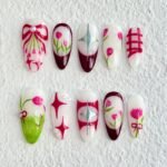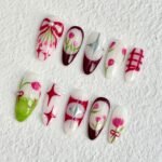 The design of “Starry Bloom” combines delicate tulip motifs with star-like accents, creating an elegant yet modern look. The bold maroon and green tones, mixed with subtle silver detailing, resemble a blooming garden at dusk under the starry sky. This set is perfect for someone who seeks a balance of elegance and boldness, symbolizing the beauty of nature’s growth and the endless possibilities of the universe.