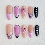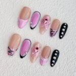 Unleash your boldest self with “Wild Romance,” a press-on nail set that fuses edgy street style with dreamy floral accents. Featuring a nude base contrasted with vibrant shades of violet, black zebra stripes, silver studs, and hand-sculpted 3D flowers, each nail becomes a mini work of rebellious art. The sleek lines, metallic details, and electric color pops make this design perfect for concerts, parties, or anytime you want to make a statement. Lightweight, reusable, and unapologetically fierce — made for those who dare to bloom on their own terms.💜⚡